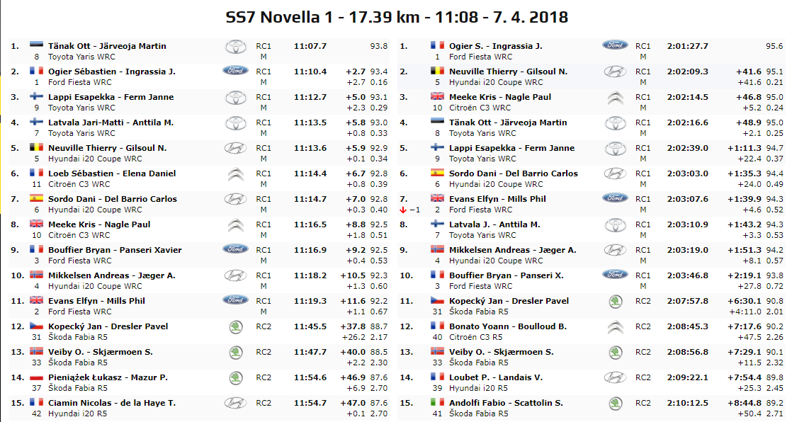 Nella SS7 Novella 1 come già anticipato precedentemente, Ott Tanak sta alzando la cresta posizionandosi col miglior tempo di prova staccando a +2.7 Sebastien Ogier e a +5.0 e a +5.8 le Yaris dei suoi compagni di squadra Lappi e Latvala. Ancora sotto tono Kris Meeke che chiude ottavo a +8.8 dall’estone, perdendo sempre di più terreno trovandosi terzo a soli due secondi. Thierry Neuville a +5.9 chiude quinto gestendo la sua seconda piazza generale mentre continuano a faticare le vetture di Dani Sordo a +7.0 ma soprattutto quella del norvegese Andreas Mikkelsen che chiude a +10.5. Male anche le due Ford Fiesta di Bouffier ed Evans che chiudono nono ed undicesimo.