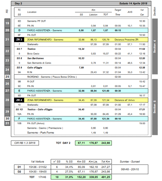 Sabato le prove speciali traslocano in provincia di Savona come nella passata edizione con “Testico”, “San Bartolomeo” e Colle D’Oggia prima degli ultimissimi 35 km della “Testico – Colle D’Oggia”. La cerimonia d’arrivo è prevista a partire dalle 19 presso l’elegante Casinò della cittĂ .