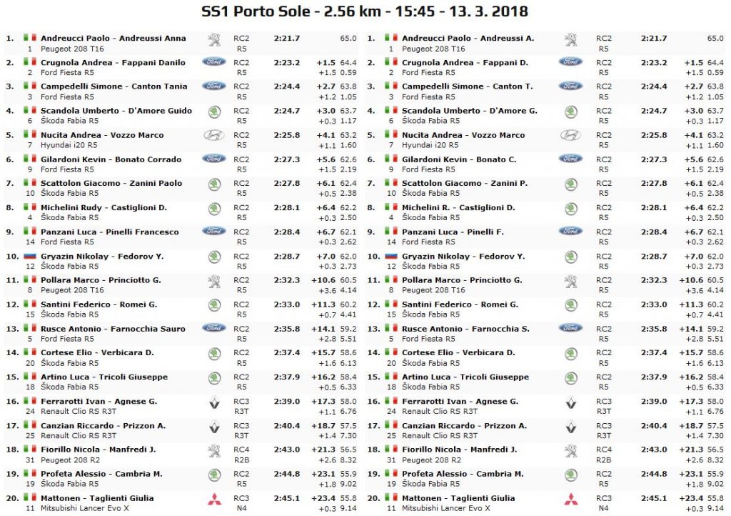 Tuttavia risultano piuttosto interessanti i distacchi nello stretto toboga lungo poco più di due chilometri. Il pilota ufficiale Peugeot ha staccato Andrea Crugnola di 1,5 secondi, Simone Campedelli di 2,7, Umberto Scandola di 3 secondi netti e Andrea Nucita di 4,1.