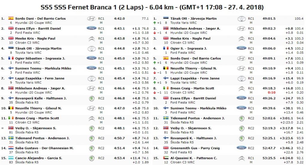 Proprio quest’ultimo vede guidare una classifica generale molto corta tra le prime tre posizioni, e vede vincitore della SS3 e SS4, conquistando così la 100esima stage vinta in carriera. Dopo la SS5 (Fernet Branca 1) vinta dallo spagnolo Dani Sordo, che sta cercando di risalire la china dopo una mattinata un po sotto tono vede a soli +0.8 il norvegese Andreas Mikkelsen, che ha guidato la classifica generale fino a questa stage, dimostrandosi veramente in grandissima forma, e a +3.1 un Kris Meeke anche lui in forma smagliante, pronto di riscatto dopo la brutta figura al Tour de Corse, gara abbandonata dopo un lungo per una nota sbagliata.