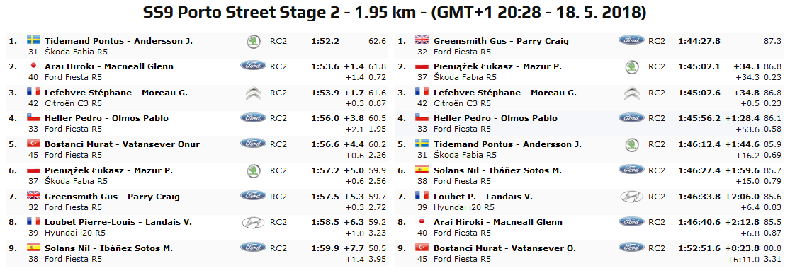 Con il leader del mondiale attardato, Lukasz Pienazek ha avuto modo di assaggiare il podio di classe, almeno dopo questa prima tappa. Il polacco è infatti secondo con la Skoda Fabia R5, davanti per soli cinque decimi ad uno Stephane Lefebvre in testa nelle prime speciali, ma poi vittima di qualche problema di troppo. Il suo distacco è quantificabile in 34″8. Ai piedi del podio, buona gara anche per il cileno Pedro Heller, quarto a 1’28” ma con la minacciosa ombra di Tidemand alle sue spalle. Chiudono la top ten Solans, Loubet, Arai e Bostanci.