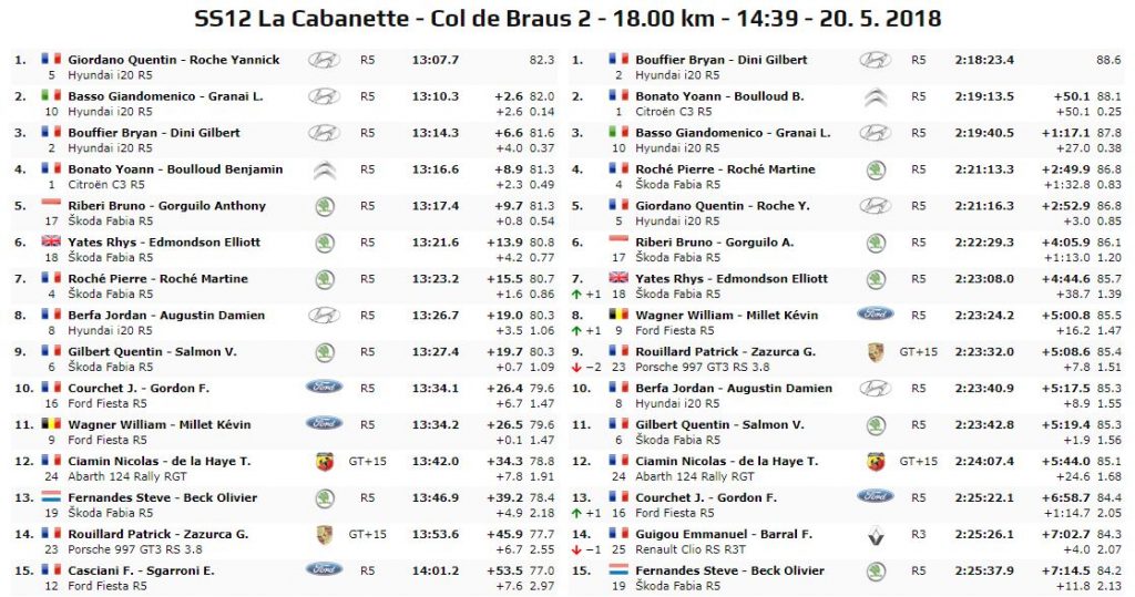 Chiudono la top five della gara Pierre Roché su Skoda Fabia R5 e Quentin Giordano su Hyundai i20 R5, vincitore di due prove speciali.
