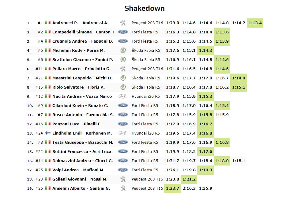 E’ ancora una volta l’equipaggio Peugeot Italia, formato da Paolo Andreucci e Anna Andreussi, il più veloce nello shakedown disputato nella prima mattinata a Campo dell’Elba su un percorso di 1,6 km. Il dieci volte campione italiano è stato autore del miglior tempo assoluto nel suo sesto passaggio sul percorso, staccando un tempo di 1’13”4.