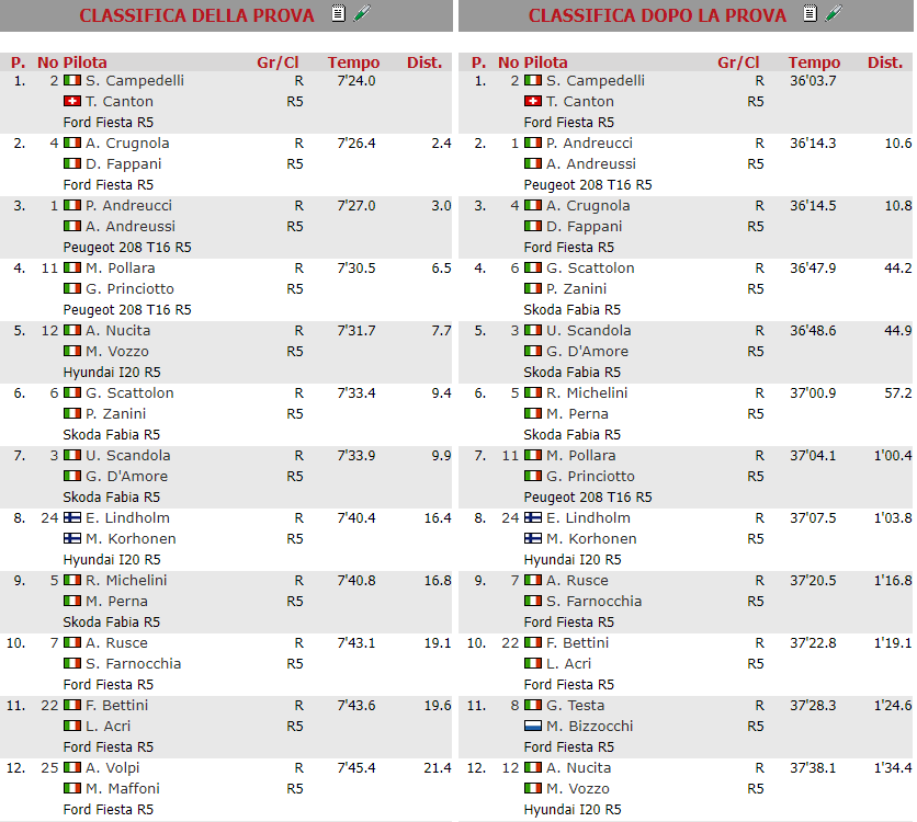La netta sensazione è che siano questi tre a giocarsi la vittoria assoluta nella tappa di domani, dato che dietro di loro i distacchi sono già importanti. Giacomo Scattolon occupa infatti una sorprendente quarta posizione ma 44″2 dalla vetta, mentre sette decimi più indietro Umberto Scandola non è riuscito a reggere il passo dei diretti rivali con la sua Skoda gommata D-Mack. Rasenta invece il minuto il gap di Rudy Michelini, sesto a 57 secondi che precede di una manciata di secondi la Peugeot 208 T16 R5 di Pollara-Princiotto. Dietro di loro, non molto staccato, c’è un ottimo Emil Lindholm; il giovane finlandese è ottavo dopo la prima giornata nella sua terza gara italiana, la prima al volante della Hyundai i20 R5.