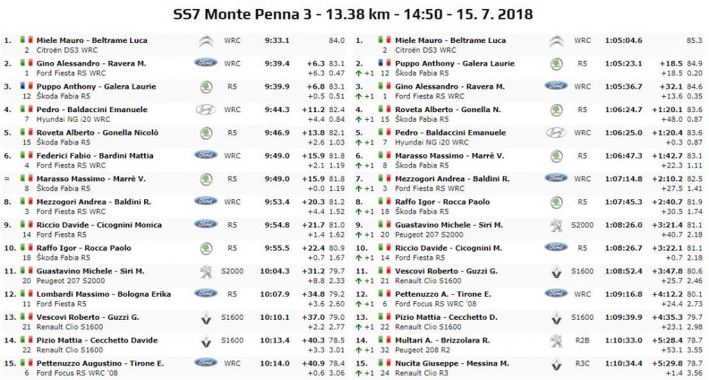 I due si sono resi protagonisti di una bellissima rimonta, con allungo decisivo proprio sulla parte finale di gara. Mentre tutti aspettavano Alessandro Gino come probabile protagonista, il vero protagonista del primo giorno è stato il francese Anthony Puppo su Skoda Fabia R5. Il francese ha fatto valere le sue doti soprattutto sulla prova “Ottone” da 14,94 km, vinta in entrambi i passaggi. Vittorie alternate con un velocissimo e sfortunato Corrado Pinzano, anch’esso su Skoda Fabia R5, che nel primo giorno si giocava il vertice prima di vanificare tutto nella giornata di domenica.