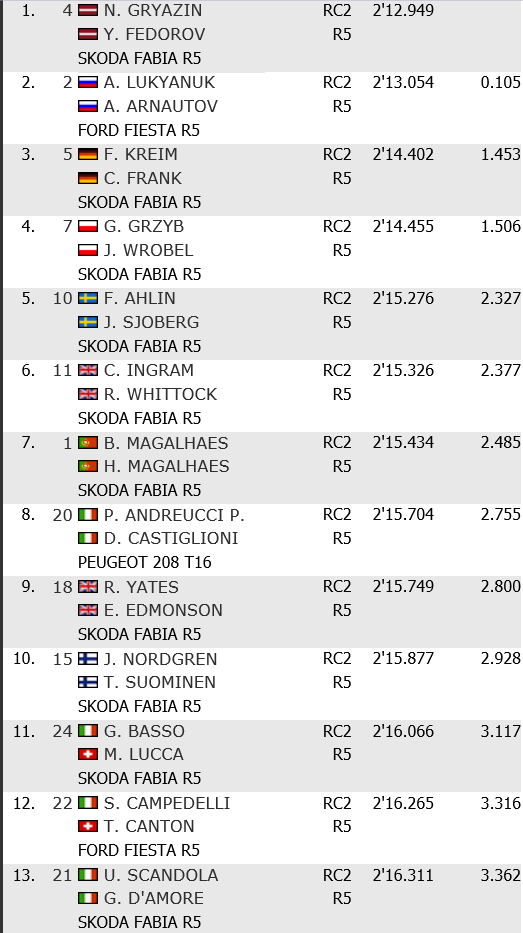 E sul breve ma intenso e molto tortuoso tratto laziale, ad avere la meglio è stato il lettone Nikolay Gryazin, driver di Sport Racing Technologies, che a bordo della sua Skoda Fabia R5 ha fatto segnare uno strabiliante 2.12.9, unico ad andare sotto al 2.13, precedendo però di solo un decimo l’ affamato zar russo Alexsey Lukyanuk, che a bordo della sua Ford Fiesta R5 ha invece fatto segnare 2.13.0, con i primi due in classifica che si sono davvero dimostrati superiori, considerando che il terzo, Fabian Kreim (Skoda Fabia R5), è invece finito indietro di oltre un secondo, con il tempo di 2.14.4.