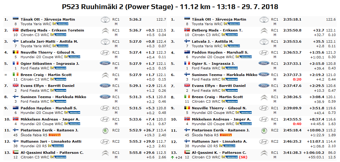 E’ Ott Tanak a far segnare il miglior tempo, quindi oltre a vincere il rally si porta a casa anche il massimo dei punti bonus in palio. Weekend strepitoso dell’estone che non sbaglia davvero niente e che annichilisce la concorrenza. Secondo tempo per Mads Ostberg che si conferma dunque al secondo posto assoluto, terzo il padrone di casa Latvala. Quarto e quinto crono rispetivamente per Neuville e Ogier, che continuano il duello a distanza in ottica campionato.
