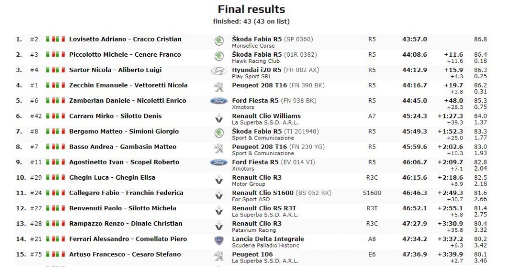La gara si è aperta all’insegna di Michele Piccolotto su Skoda Fabia R5 che vince i primi scratch, alternandosi con De Cecco su Hyundai i20. La speciale numero 5 diventa determinante. De Cecco si ritira, Piccolotto vince ed inizia uno sprint a due con Lovisetto che piano piano inizia a ricucire il distacco con la testa. Fino al sorpasso al secondo giro sulla prova Zero Branco che determinerà la sua vittoria.