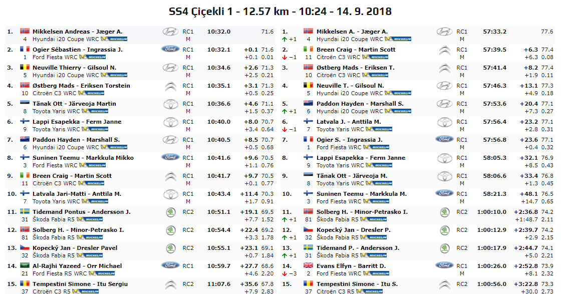 Prova con meno problemi, e feeling migliori per i piloti che sembrano aver trovato la giusta quadra con la propria vettura. Il risparmio delle gomme nella precedente stage ha fatto si che Andreas Mikkelsen si portasse davanti a tutti e così è stato, davanti a un Ogier in netta ripresa ed al compagno di squadra Thierry Neuville. Bene Ostberg in quarta piazza a +3.1 un po meno Ott Tanak, quinto, che ora si trova ad inseguire in generale in nona piazza a +33.4. Breen perde qualcosina, mentre ancora molto male le Ford di Suninen ed Evans ed un Jari-Matti Latvala in difficoltà in questa speciale. Zampata di Tidemand nel Wrc2 che vince la stage guadagnando +4.0 sul compagno di squadra e leader della classifica Jan Kopecky. Tempestini amministra in terza posizione pagando +16.5, mentre ancora molto ampio il distacco delle prime tre vetture rispetto le altre. Wrc3 che non regala molte sorprese, Franceschi butta via una buona occasione per riagganciare le posizioni più alte ma paga +46.5 sull’estone Torn, che vince la prova seguito da Denis Radstrom e il leader della classifica provvisoria Julius Tannert.