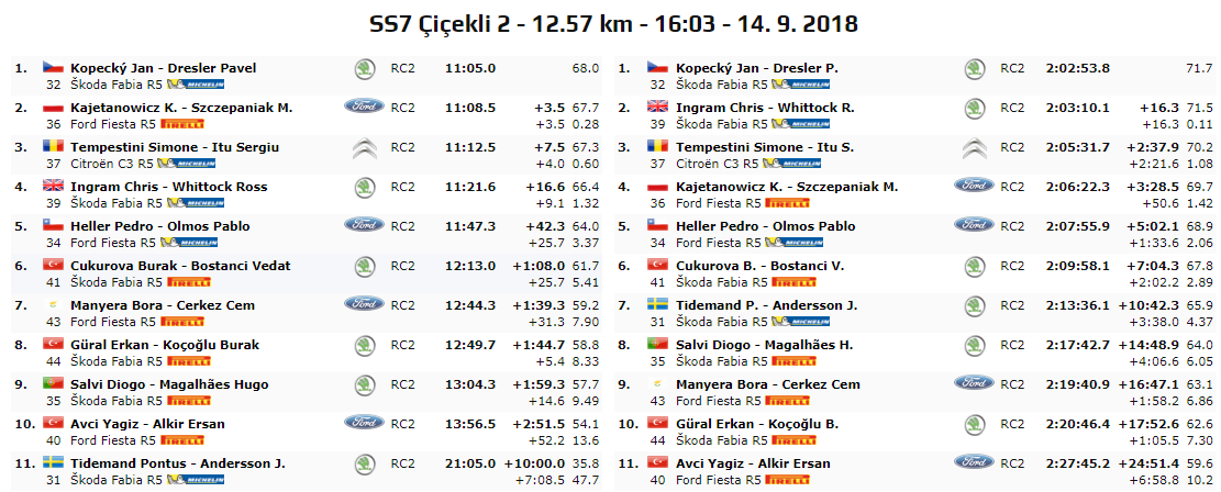 In questo rally abbiamo imparato tutti che le sorprese non finiscono mai, e çiçekli 2 ne ha dato la dura e vera prova. Kopecky si riprende la vetta coi denti rifilando un +16.3 in overall a Chris Ingram illuso da quella vetta tanto sognata, e un pesantissimo +2.37.9 al nostro Simone che nonostante le due forature della ss5 si è ripreso molto bene. Un ottimo Kajto in ripresa chiude a +3.5 nella stage portandosi così quarto in generale. Ma Tidemand dov’è?