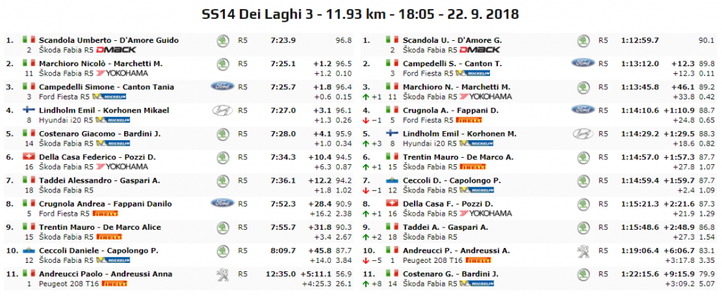 Clamoroso cappottamento di Paolo Andreucci nell’ultima prova che riesce a ripartire ma perde tantissimo tempo. Crolla anche Crugnola che perde oltre 28 secondi nell’ultima prova e anche la terza piazza nella classifica assoluta. Strepitoso terzo Nicolò Marchioro con la Skoda Fabia R5.