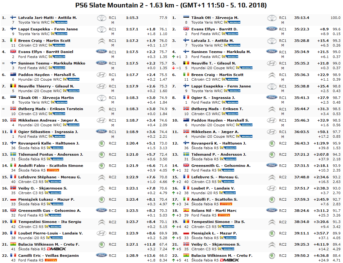 Il finnico precede il compagno di team Lappi e Craig Breen di oltre un secondo e mezzo. Quarto tempo con tempo identico per Evans e Suninen, con quest’ultimo che scavalca nella classifica generale Neuville (settimo parziale). Ottavo a +3.0 il leader Ott Tanak, che opta di non correre rischi eccessivi. Ancora un tempo alto per Sebastien Ogier, la cui Fiesta arranca nel breve crono da compiere.