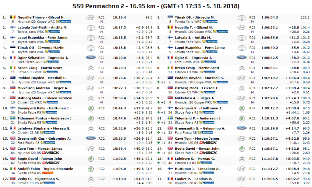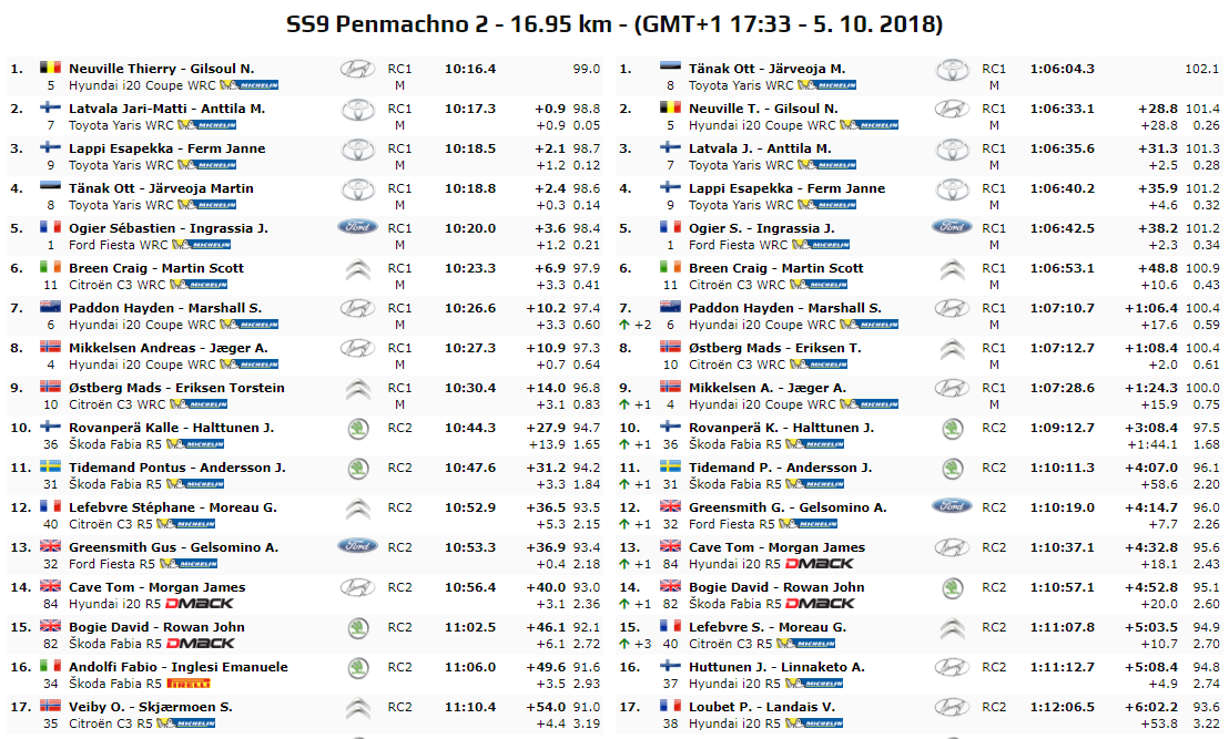 Il primo degli inseguitori è il belga Thierry Neuville (Hyundai I20) staccato di 28” dall’estone, il belga per tutta la giornata lamenta una vettura non propriamente perfetta sul fango gallese. Subito dietro raccolti in una manciata di secondi troviamo Latvala a 31”. Quarta piazza per la terza Toyota in gara quella di Lappi, mentre in quinta piazza troviamo Ogier, in rimonta dopo una prima parte di giornata da dimenticare, causa un testa-coda sulla Penmachno che causa un problema al cambio della Ford perde la prima e la seconda marcia.