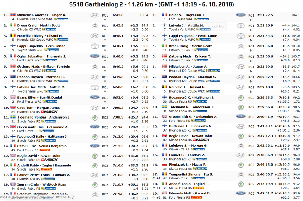 Alla fine di questa lunga, spettacolare e difficile giornata del Wales Rally GB 2018, avente ben nove prove speciali senza assistenza alcuna, abbiamo dunque Ogier in testa alla classifica, a bordo della sua Ford Fiesta WRC Plus con cui però il driver di Gap non si trova “troppo” bene sugli sterrati britannici.