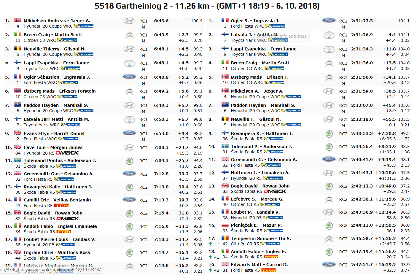 Capitolo diverso per Craig Breen: L’irlandese, zero sicurezze in ottica 2019 e risultati altalenanti, avrebbe proprio bisogno di un podio nell’evento più vicino alla sua patria Irlanda. La sua Citroen C3 WRC ha dimostrato però di essere molto competitiva su questi fondi, e dal primo posto è staccato soli di 13.5 secondi, a +1.7 dal podio virtuale di Lappi.