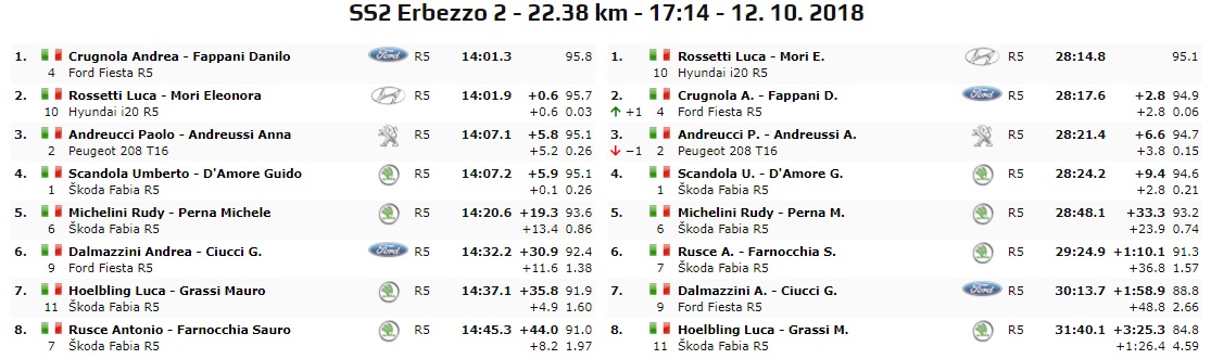 Il venerdì di gara continua con la Erbezzo 2. Gran bel tempo di Andrea Crugnola che si aggiudica la prova. Segue a ruota (0,6 secondi) uno scatenato Rossetti che mantiene così la leadership della classifica generale. Chiude il podio di speciale un guardingo Paolo Andreucci, in ritardo di quasi 6 secondi dal vincitore. Ancora quarto tempo, come quello che sta occupando in classifica generale per Umberto Scandola.