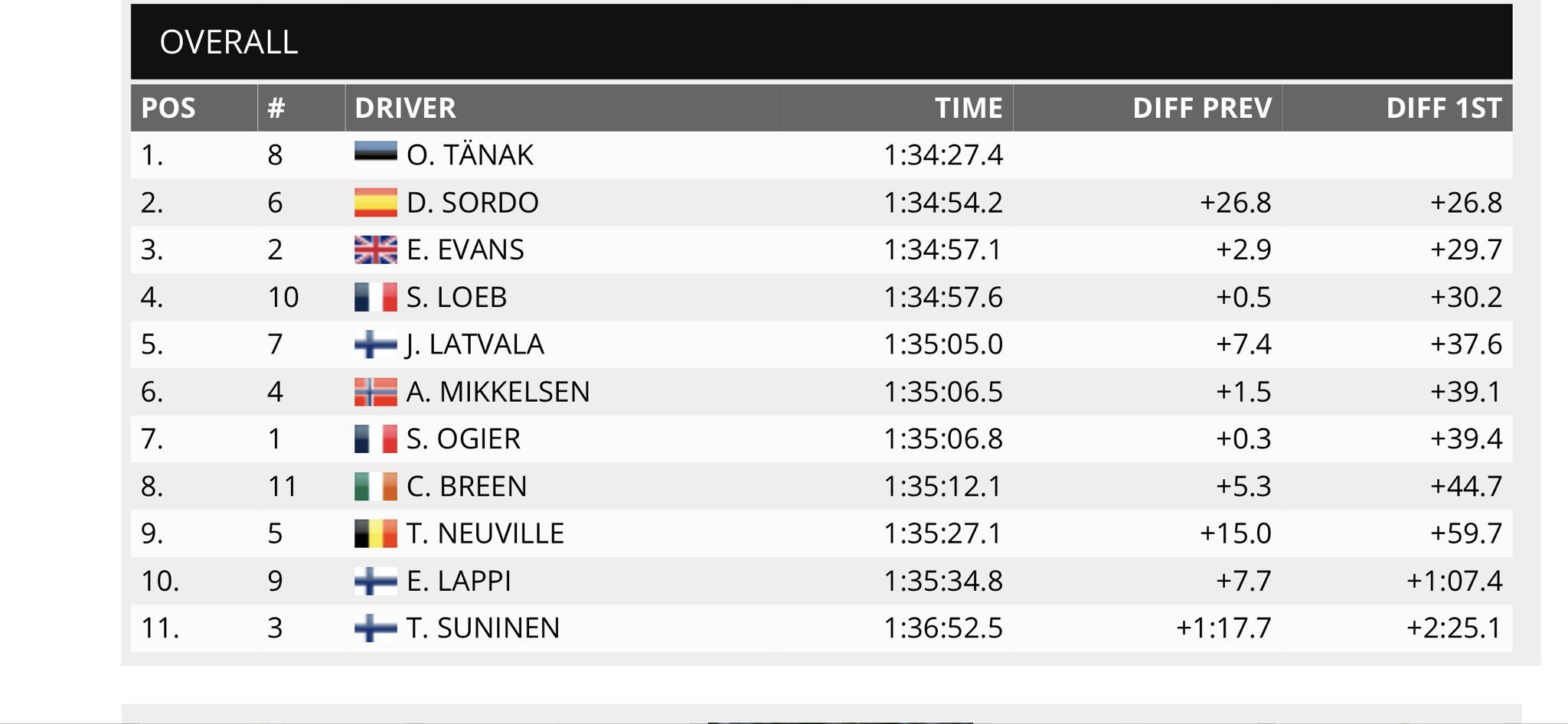 In seconda posizione chiude Dani Sordo; il padrone di casa è il più veloce di casa Hyundai, staccato di 26″8 dal leader. Molto positiva la prova di Elfyn Evans che chiude in terza posizione con 29″7 da Tänak. Per lui ci sarà comunque da superare l’esame delle prove asfaltate nelle due giornate successive.