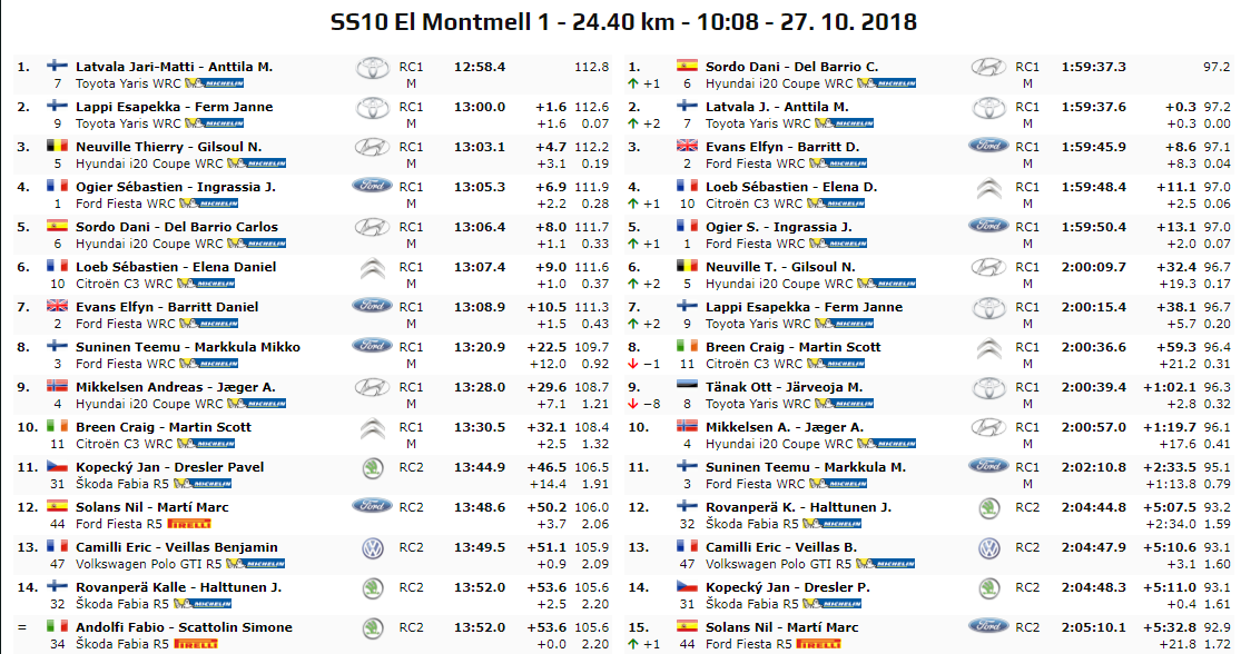 Si riaccendono i semafori nella seconda (non più terza) prova della mattinata e la “El Montmell” lascia spazio ad un clamoroso colpo di scena. Ott Tanak a causa di una foratura, perde +1.43.0 dal suo compagno di squadra Jari-Matti Latvala (vincitore della prova), finendo clamorosamente nelle retrovie della classifica. Appaiato alla Yaris N°7 troviamo l’altro finlandese Esapekka Lappi a +1.6 ed in terza molto bene Thierry Neuville che sembra essere rinato dopo la brutta prestazione di ieri a +4.7. Seguono Seb Ogier, Sordo, Loeb ed Evans. Ancora molte difficoltà per Suninen, Mikkelsen e Breen in ottava nona e decima piazza.