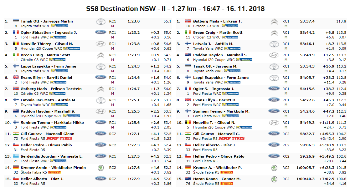 Nel secondo round, Ott Tanak è il più veloce davanti ad Ogier e Neuville a +0.2 davanti a Breen, Lappi, Ostberg, Latvala, Paddon, a chiudere la top10 Teemu Suninen. Wrc2 invariato