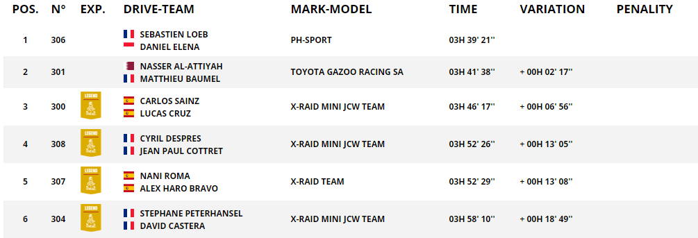 Terzo assoluto, dopo la sua difficile giornata, Stephane Peterhansel. Il pilota di Échenoz-la-Méline, 13 volte vincitore di questa gara, continua giorno dopo giorno ad allontanarsi sempre più da quel quattordicesimo successo, recato al  momento a 41’14 dalla sua Mini JCW Buggy ufficiale, gestita da X-Raid.