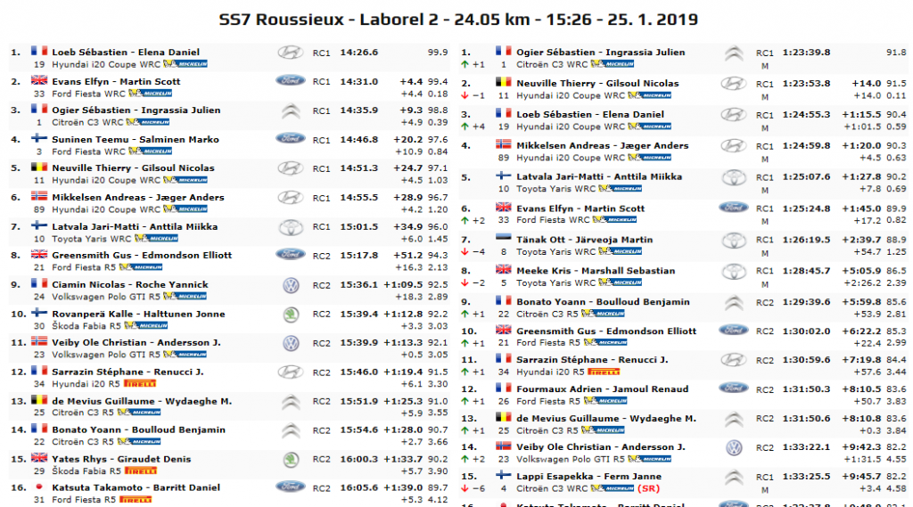 Insomma, classifica totalmente rivoluzionata dopo questo settimo tratto cronometrato, con Sèbastien Ogier in testa (Citroen C3 WRC), seguito dal belga Thierry Neuville (Hyundai I20 WRC) a 14 secondi, il quale però potrebbe perdere altro tempo nella prossima prova a causa di pneumatici chiodati su fondo asciutto.