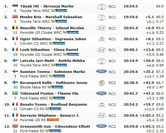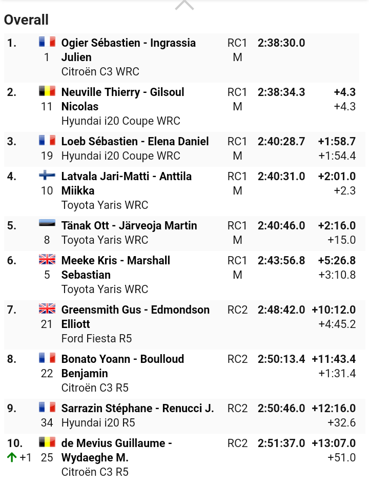 Terza posizione in classifica per il “cannibale” Sèbastien Loeb che prende sempre più le misure alla Hyundai I20 WRC. Quarta piazza ad appena 2” dal francese per Jari-Matti Latvala (Toyota Yaris). Il pilota finnico nella giornata odierna, ha fatto riscontrare ottimi crono. Quinta postazione per lo scatenato Ott Tanak, sempre con la Toyota Yaris. Categoria WRC2, comanda ancora Gus Greensmith che prova a tenere alto l’onore M-Sport, dopo il mezzo disastro combinato in queste tre giornate delle cosiddette prime guide.