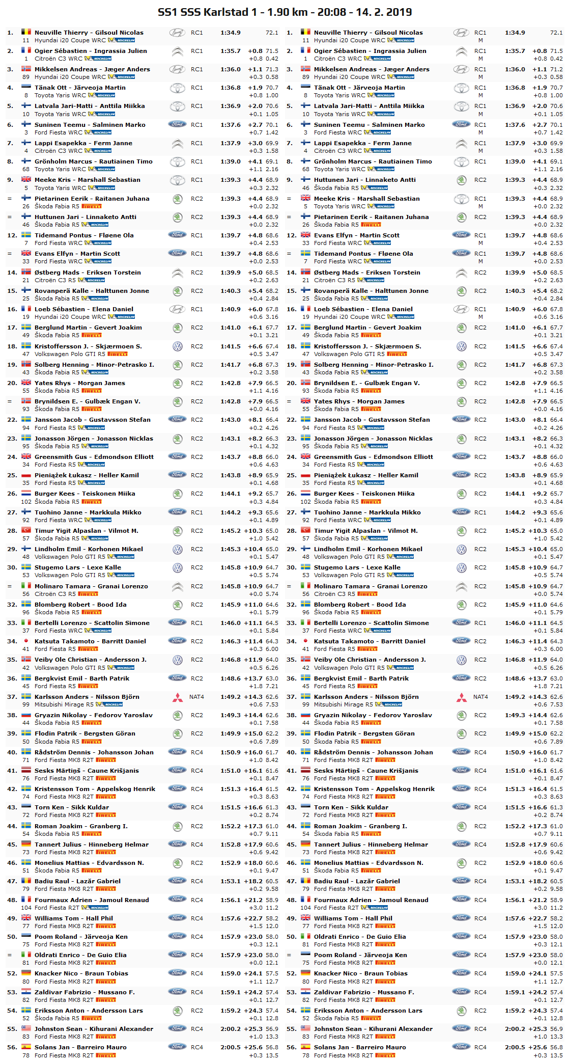 Chiudono la top ten ben tre piloti con un tempo identico: Meeke, Pietarinen e Huttunen. Trentesimo posto per Lorenzo Bertelli e Simone Scattolin, che optano per un avvio cauto a bordo della Ford Fiesta Wrc Plus.