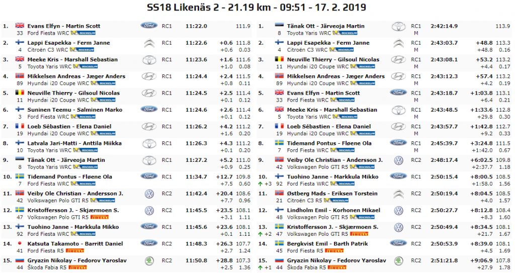 Secondo loop della prova, vede vincitore l’alfiere del team M-sport Elfyn Evans, concludendo davanti a Esapekka Lappi che mantiene così salda la seconda posizione e il connazionale Kris Meeke, un Po altalenante in questo weekend. Segue Andreas Mikkelsen quarto, davanti al compagno di squadra Thierry Neuville. In difficoltĂ Tanak che chiude col nono tempo Ma comunque saldamente al comando.