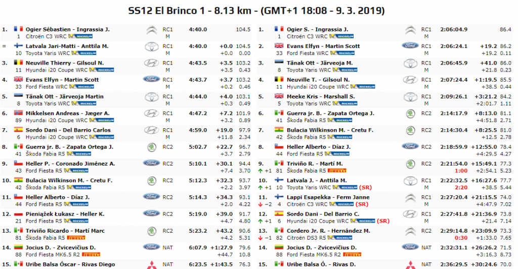 Firma sulla stage per Sebastien Ogier (a pari tempo con Latvala) che lancia un segnale chiaro agli avversari: nessuna intenzione di sedersi sulla posizione di partenza. Ottimo terzo tempo per Neuville che in una prova breve riesce a mitigare il gap manifestato finora. Finisce la prova visibilmente contrariato Kris Meeke che pare avere dei problemi meccanici alla sua Toyota. Dopo lo stop parcheggia per qualche minuto la macchina ma poi riparte e riesce a raggiungere l’assistenza di Leon.
