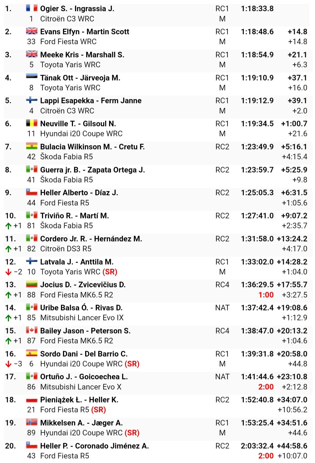 Ancora Sebastien Ogier che allunga su Dani Sordo ed Elfyn Evans. Buona anche la prestazione di Kris Meeke, mentre nel WRC2 PRO ritiro per il polacco Pieniąžek.