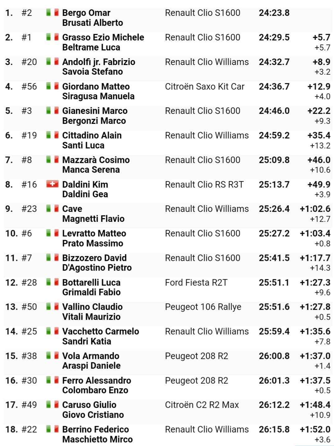 Grandissima prestazione per Fabrizio Andolfi navigato da Stefano Savoia che chiude sul terzo gradino del podio con la sempreverde Renault Clio Williams, per lui anche la grande soddisfazione di vincere due prove speciali. Quarta piazza per la Citroen Saxo Kit di Matteo Giordano e Manuela Siragusa. Chiude la top five Marco Gianesini con Marco Bergonzi su Renault Clio S1600.