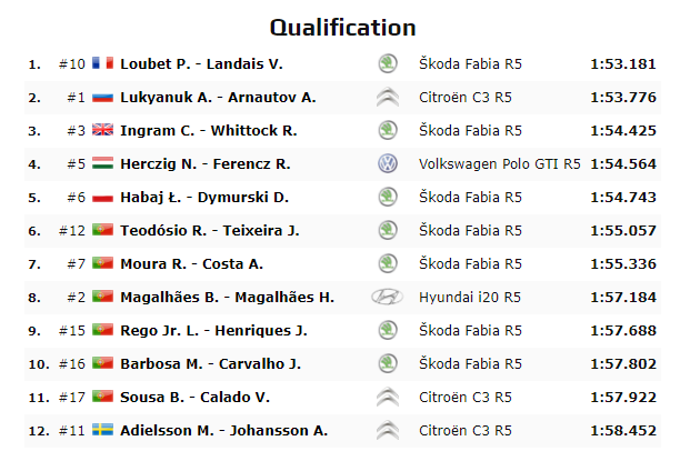Qualificazioni che hanno visto in alto alla classifica un outsider molto pericoloso per il pilota russo, neo acquisto Citroen, Aleksey Lukyanuk, ossia il francese Pierre-Louis Loubet su Skoda Fabia griffata OSCARO/2C Competition, piazzando la sua vettura davanti di 0″595 proprio dal pilota russo. Con questo piazzamento potrĂ  godere del vantaggio di scegliere per primo in quale posizione partire per la Prima Tappa della gara sterrata di questa sera.