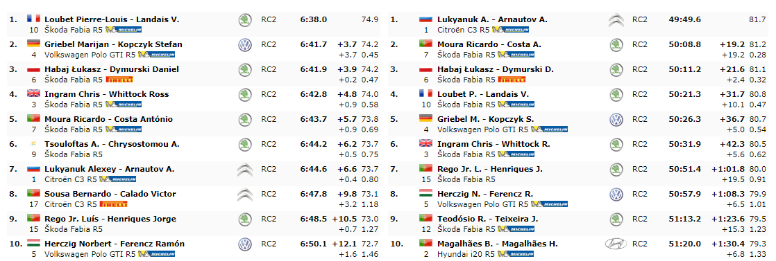 Si va in scena con la prima tappa odierna a Pico de Pedra, parte molto scivolosa e difficile, situata nell’entroterra di questa fantastica isola. Ad imporre le regole è il russo Aleksey Lukyanuk, attuando un passo di gara molto alto segnando il miglior tempo di tutti. Subito dietro di lui di appena +1.0 troviamo il pilota di casa Ricardo Moura, risalendo la china in seconda posizione generale dopo il mezzo disastro compiuto dal pilota francese Pierre-Louis Loubet che scivola in terza generale chiudendo col settimo tempo a +9.3. Dietro Moura un sfilza di Skoda Fabia, in ordine Ingram, Habaj e Tsouloftas, in grande ripresa segnando il quinto tempo. Top10 conclusa da Herczig, Loubet, Rego, Griebel e Magalhaes.Â