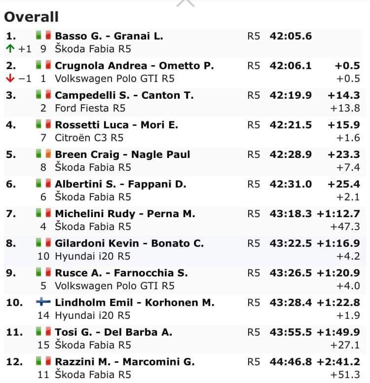 La prova è stata vinta ancora una volta da Andrea Crugnola con sette decimi su Giandomenico Basso. Seguono Rossetti che sta trovando la giusta quadra con la Citröen C3 R5 e un Simone Campedelli in leggera difficoltà che non tiene il passo dei primi due.