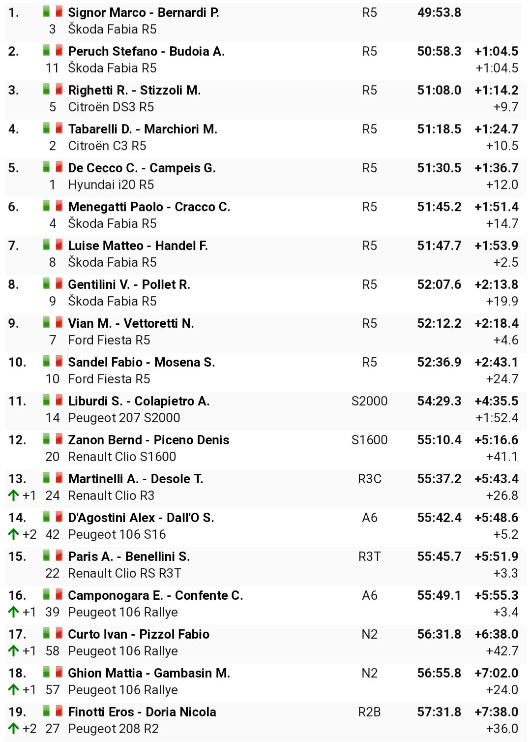 Sul podio sono saliti anche Budoia-Peruch (Skoda Fabia), secondi a 1.04.5 e Righetti-Stizzoli (Citroen Ds3), terzi a 1.14.2 dai vincitori. Tabarelli e De Cecco, altri due piloti che il Bellunese lo hanno già vinto in passato (ben quattro volte il friulano che ne è il primatista) si sono dovuti accontentare, rispettivamente del quarto e quinto posto assoluto, forse a conferma che il lavoro che li attende per “prendere in mano” Citroen C3 e Hyundai I20 è tanto.