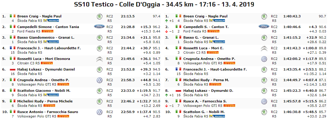 Attardato in prova di oltre 4 secondi da Breen, Simone Campedelli chiude secondo la SS10 e secondo nella classifica generale. Nulla ha potuto il driver Orange1 di fronte ad una prestazione veramente di un altro pianeta quella sfoggiata da Craig in questa ultima e complessa prova.