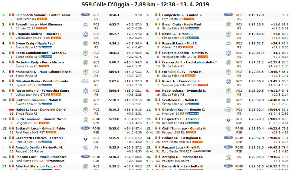 A Colle San Bartolomeo a fare la voce grossa è Craig Breen. La sua Fabia R5 segna un tempo mostruoso e rosicchia quasi due secondi a Campedelli, in assoluta posizione difensiva. Terzo ancora Basso, che non riesce a trovare il ritmo giusto, quarto Rossetti. Crugnola segna invece il quinto parziale. Giochi dunque apertissima per la vittoria finale, con un testa a testa serrato tra Campedelli e Breen.