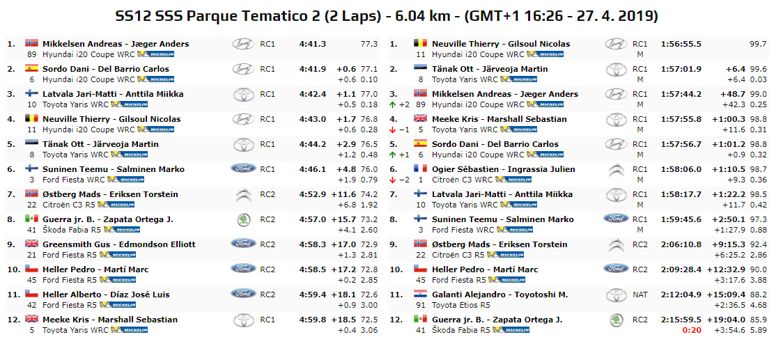 La giornata è iniziata con uno scratch di Neuville, partito a fionda esattamente come aveva finito la prima tappa. Le veloci speciali di “Mataderos-Chucilla Nevada” e “Chuchilla Nevada-Characato” hanno però visto la pronosticabile reazione di un Ott Tanak indiavolato, e capace di mettere a segno due migliori tempi. La risposta del belga non si è fatta attendere, grazie ad un crono migliore nell’ultima prova spettacolo anche se solo di 1″2. Il distacco tra i due a metà prima tappa è quindi di soli 6″4, con una vittoria che pare davvero possa restare in lizza fino in fondo.