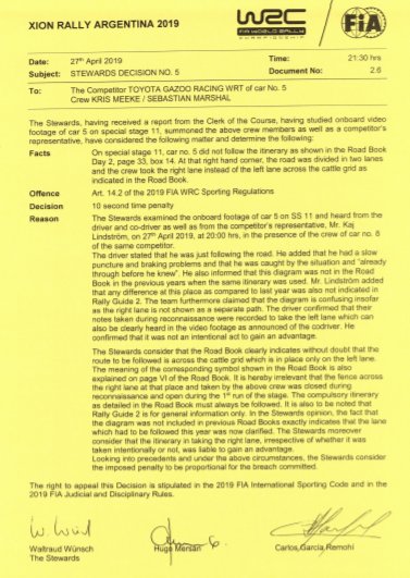 Alla fine le penalizzazioni sono arrivate, ed hanno riguardato coloro che non hanno seguito il percorso previsto dal road-book. Si tratta diMads Ostberg (Citroën C3 R5), Ott Tänak (Toyota) e Kris Meeke (Toyota) puniti con 10″ di penalità