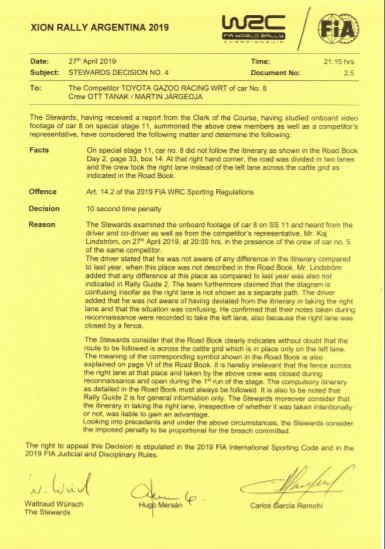 Nella serata di ieri Sébastien Ogier e il team Citröen avevano preannunciato ricorso contro alcuni equipaggi per un mancato rispetto del roadbook di gara. Dopo un’attenta esaminazione da parte della federazione, la richiesta esaminata è stata accolta, con conseguente penalizzazione di tre equipaggi.