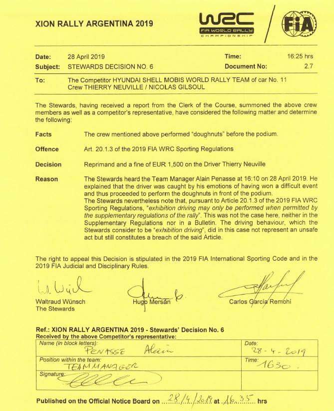 Un gesto che non è piaciuto affatto ad uno Steward presente in loco, che prontamente ha presentato un esposto all’organizzazione della kermesse sudamericana al fine di punire la scorribanda proibita. Neuville è infatti stato multato di 1500 €, una cifra irrisoria certo, ma comunque simbolica e che sa di avvertimento per le eventuali vittorie future da festeggiare con… più calma.