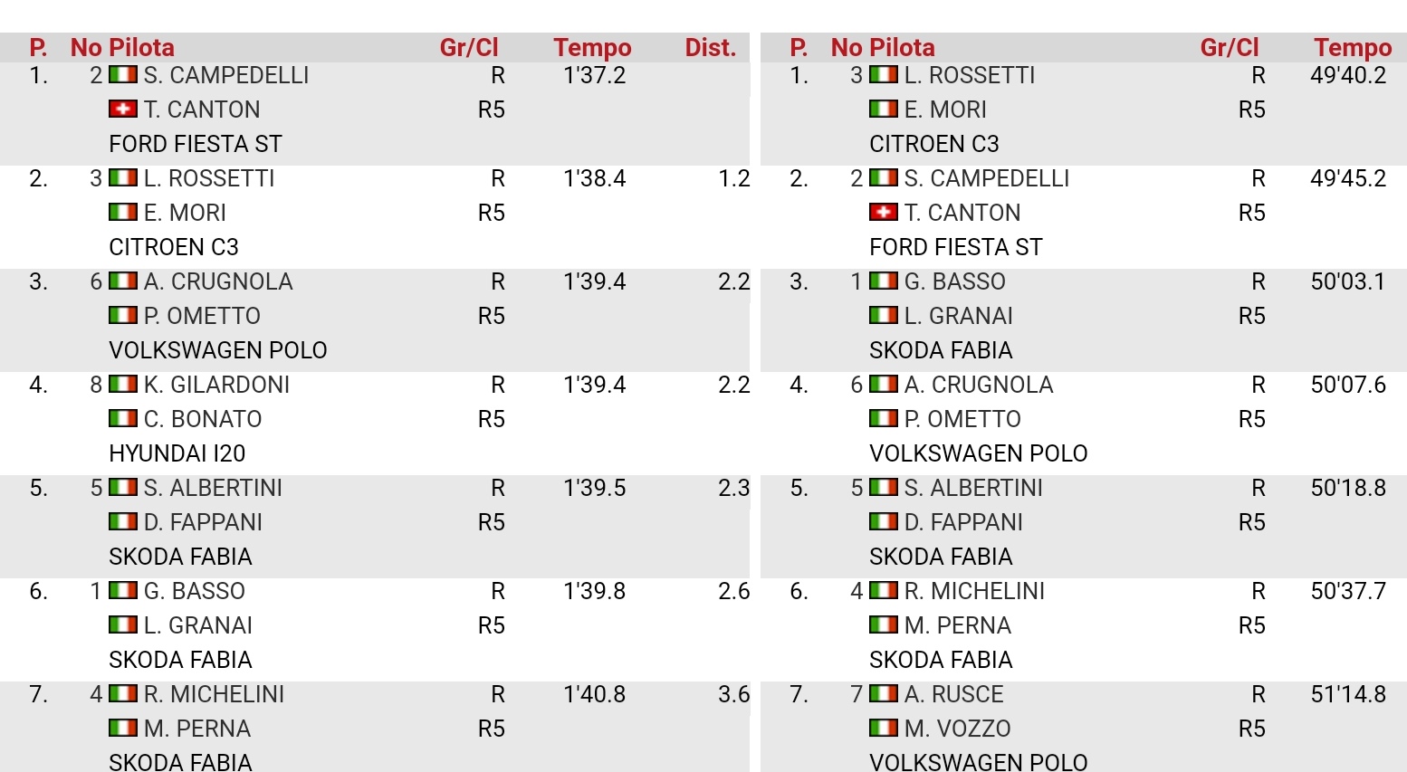 Si cambia prova, ma la musica rimane invariata. Luca Rossetti domina in lungo e in largo con questo Targa Florio e lo sta dimostrando prova dopo prova, seguito da Giandomenico Basso che racimola qualcosa da Simone Campedelli che chiude quarto a+2.1. Medesimo tempo per Andrea Crugnola dimostrazione del fatto che il ritmo è alto e non vuole mollare la presa sui due piloti davanti.