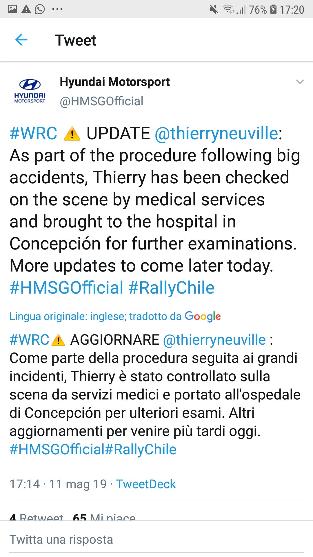 Hyundai Motorsport tramite il suo canale ufficiale di Twitter alle 17.14 avvisa che si stanno seguendo le normali procedure in caso di uscita di strada. L’equipaggio è stato trasportato in ospedale per controlli è piĂą tardi verrĂ no dati ulteriori aggiornamenti.