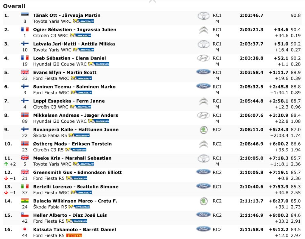Nella classifica generale dopo la prima tornata sulle prove di oggi troviamo Tanak che aumenta il distacco su Ogier (+34,6 secondi dalla vetta) e Latvala (+51 dalla vetta). Ad un secondo solo dal finlandese troviamo in grandissima rimonta un ritrovato Loeb.