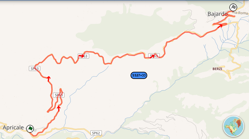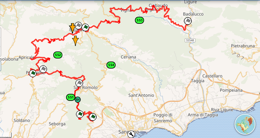 Ecco il percorso della prova speciale nella stagione 1989, grazie al sito www.rally-maps.com. In quell’anno i concorrenti del rally di Sanremo la percorsero due volte (p.s 27/33), partendo dalla cittadina di Perinaldo e concludendo il tratto cronometrato proprio sul mitico tornante destro che porta al paese di Bajardo.