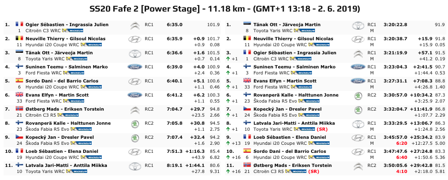 Tantissima strategia anche per Hyundai Motorsport, con Loeb e Sordo a totale servizio della possibile rimonta di Neuville. Così come nella giornata di sabato, anche stamattina il francese e lo spagnolo si sono presentati in ritardo al CO della SS16 Montim 1 di 8.76 km, pagando penalità per incidere sull’ordine di partenza e permettere al compagno belga di approfittarne. Gara tutta in salita per Loeb per il problema tecnico che ha messo fuori gioco sia lui che Sordo. Il belga Neuville ha provato a spingere ma Tanak ha piazzato due vittorie di speciale anche la domenica mattina e solo su Montim 2 il belga si è imposto portando il suo ritardo a 16,6 secondi prima della Power Stage.