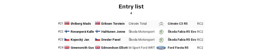 Sono quattro gli iscritti alla gara Italiana, dopo che il polacco Łukasz Pieniązek ha annunciato lo stop al suo programma per motivi di budget. Debutto in Sardegna per Kalle Rovanperä con la nuova Škoda Fabia R5 Evo che verrà affiancato dal ceco Jan Kopecký, profondo conoscitore delle mille insidie della gara sarda. Presenti anche il team M-Sport che schiererà una sola vettura, affidandola a Gus Greensmith (anche lui al debutto in Sardegna) e il team Citröen Total con l’esperto norvegese Mads Ostberg.