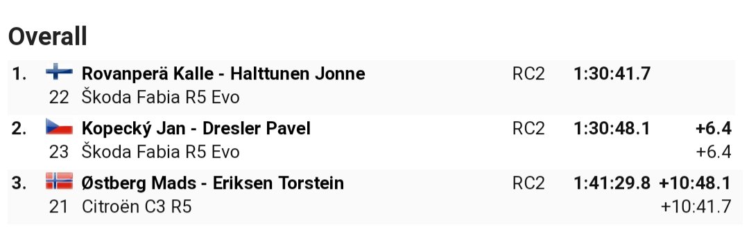 Al termine di una giornata ricca di colpi di scena, comanda le operazioni il russo Nikolay Gryazin su Skoda Fabia R5. Il pilota di casa SRT, prende il comando proprio nel corso dell’ultima prova speciale, approfittando di un problema occorso a Loubet. Seconda posizione per un veloce Takamoto Katsuka (Ford Fiesta R5), mentre al terzo posto ottima prestazione per il nostro Simone Tempestini in gara con la Hyundai I20 R5. Completano la top five il polacco Kajto in gara con la Skoda Fabia R5 e Marquito Bulacia anche lui su una vettura della casa ceca. Out fin da subito, l’altro pilota tricolore Fabio Andolfi, per lui rally2, ma prestazione ormai compromessa.