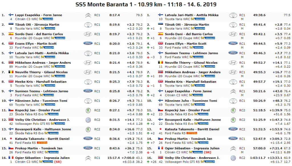 Ultima stage della mattinata e si chiude con un’enorme colpo di scena. Il campione del mondo Sebastien Ogier fuori dai giochi per un’uscita di strada a causa di una rottura della sospensione. Ne approfitta il compagno di squadra Esapekka Lappi che segna un ottimo tempo davanti a Tanak ed Evans. Il leader della classifica generale rimane Latvala che chiude quarto. Le parole di Elfyn: