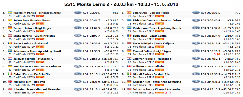 Al terzo posto l’esperto Tom Kristennson, driver svedese, staccato di 1’55.5 dalla vetta grazie ad una prestazione costante senza errori, rifilando comunque un minuto al promettente rumeno Raul Badiu, a sua volta capace di una gara d’autore, pronto ad approfittare di qualsiasi errore in top three domani.